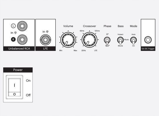 Vestra W12 oferuje wejścia stereo RCA i LFE RCA oraz 12 V trigger.