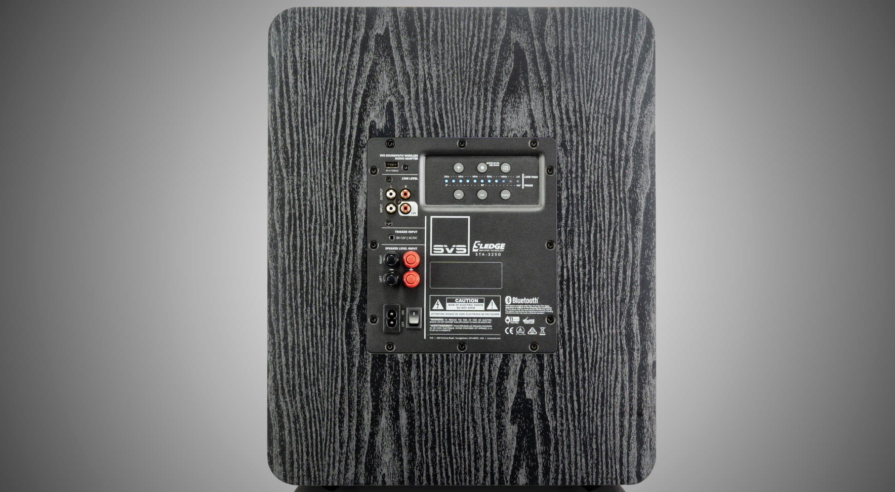 Przyciski sterujące pozwalające na precyzyjne i wolne od szumów zmiany ustawień. Zestaw gniazd połączeniowych ułatwia integrację subwoofera z każdym systemem audio i systemem kina domowego.